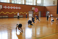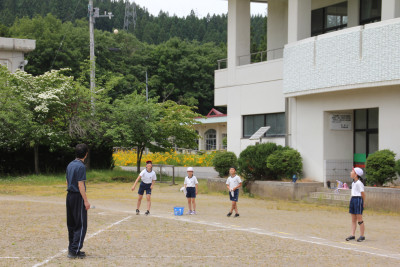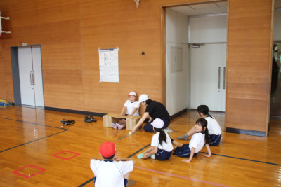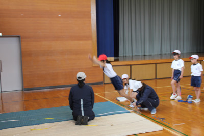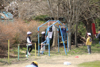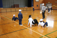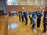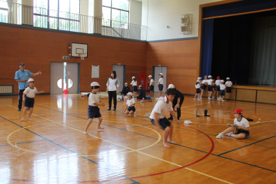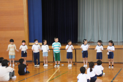 はじめの式を自分たちで進め、自分たちが作ったおもちゃでこども園の皆さんに遊んでもらうことができました。こども園のみなさんからも「おもしろい」という言葉が聞かれたり、マツボックリのけん玉に一生懸命に取り組んだりする姿が見られました。最後には、じゃんけん連射で一緒に遊びました。