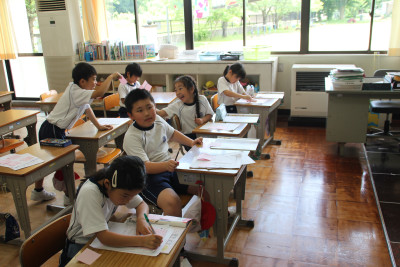 3年生は、外国語活動でALTの先生と一緒に、英語の表現を使って相手のすきな食べ物や色などを尋ねる活動を行っていました。いろいろな友達に繰り返し質問しながら、楽しそうに活動をしていました。