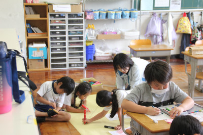 1年生は、「せんのぼうけん」という自由に描いた線から広がったイメージを描く学習をしていました。思い思いに描いた線は一人ひとり違っていて、そこからイメージしたことを集中して画用紙に描く様子が見られました。