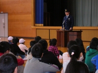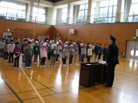 昨年度は、喜多方市内で不審者が出没したとの通知が数件ありました。高郷地区ではそうした事案の発生はありませんでしたが、子供達が被害に遭わないように、喜多方警察署の高郷駐在さんをお呼びして、4月10日に防犯教室を行いました。「いか・の・お・す・し」を合い言葉に、不審者への対応を全校児童が学びました。