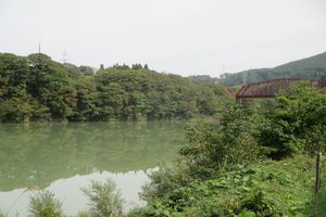【尾登駅から喜多方へ、阿賀川と鉄橋を眺める】