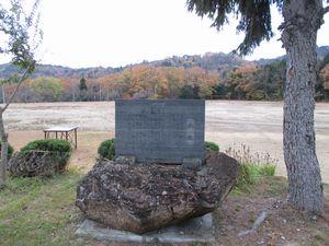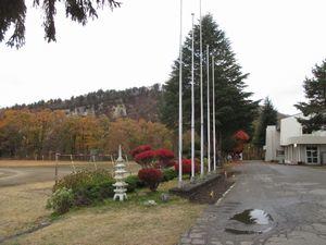 【正面玄関前、校歌の歌碑と正門方向を眺める】