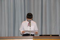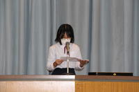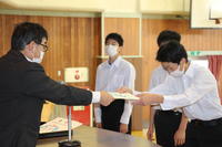 2020年9月28日 11時28分今日(28日)の『朝の集い』では、24日(木)に実施された「耶麻中体連新人大会」で入賞を果たした選手への賞状伝達を行いました。卓球種目では男子オープンシングルス第2位の佐藤圭君、1年シングルス第3位の高久賢也君、剣道種目では女子団体2位の代表佐藤菜央さん、男子団体3位の代表和田俊政君、個人第3位の佐藤叶汰君の5名が登壇し、受賞しました。続いて、12日(土)に実施された全会津新人陸上大会も含めて、3つの部の2年生の代表(陸上、渡部君。卓球、長水さん。剣道、佐藤さん。)が新人大会の感想を発表しました。いずれの発表者も「練習の成果が発揮できたこと」「見つかった課題をこれからの練習に生かしていくこと」を力強く発表してくれました。