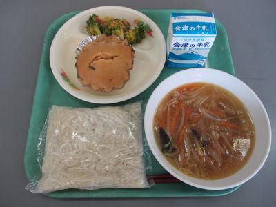 2015年3月4日 18時46分今日の給食は,サンマ-麺,黒糖蒸しパンです。