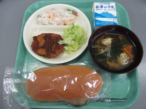 2015年12月4日 12時40分 今日の給食は、コロッケサンド、クリーム和え、麦入り肉団子スープ、牛乳です。