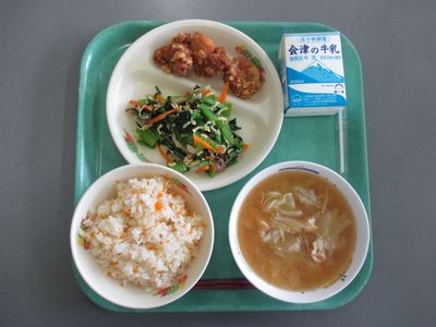 2016年6月9日 13時18分 今日の献立は、 人参ご飯 味噌汁 鳥の唐揚げ シメジ和え 牛乳 でした。
