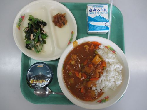 2016年6月13日 12時57分 今日の献立は、チキンカレーライス アスパラ入り海藻サラダ 富士山ゼリー 牛乳でした。