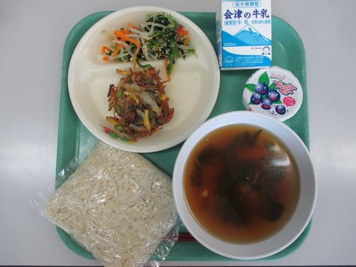 2016年6月15日 13時11分 今日の献立は、 てんぷら麺 ピーナッツ和え ブルーベリーゼリー 牛乳 でした。