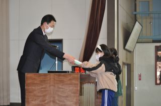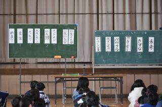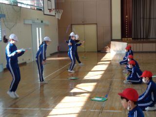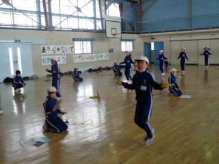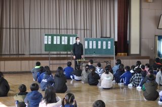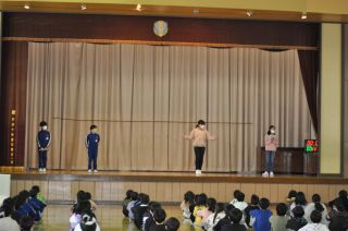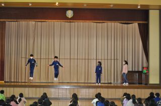 2月24日(金)の全校集会で、市環境ポスターコンクール、子ども災害事故防止習字ポスター展の表彰を行いました。また、なわとびの模範披露を行いました。なわとび記録会でも好記録を残した子ども達のすばらしい模範発表に大きな拍手をおくりました。