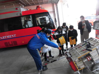 消防車・救急車・レスキュー車は、見た目は何となく似ているが、乗せている道具は全然違う。3グループに分かれ、消防士さんは一つの車両を10分以上も丁寧に説明してくださった。
