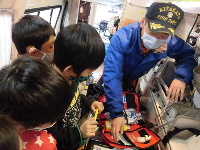 救急車には包帯や注射、AED、気道を確保する装置などがあり、小さな病院みたい。