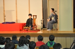 2015年11月24日 10時01分 11月20日に「落語鑑賞教室」が行われました。今回は10月に行われた「落語教室ワークショップ」に続く教室で、プロの落語家さんのお話を聞くばかりでなく、ワークショップで習った「お囃子」や「小噺」に児童が挑戦するコーナーもありました。