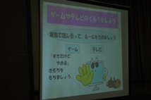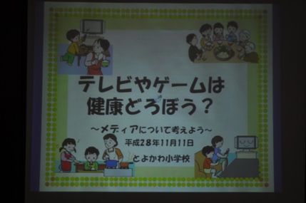 2016年11月11日 11時48分11/11(金)、児童集会で保健委員会の発表がありました。「テレビやゲームは健康どろぼう?」と題して、メディアについて考えようというものでした。「ゲームをやりすぎちゃうのまき」、「メディアづけチェック」、「メディアづけになるとどうしていけないの」、「メディアの利用」、「テレビやゲームの工夫をしよう」という構成でした。プロジェクターを使いながら、児童による発表だったので、みんな真剣に聴き入っていました。テレビやゲーム、インターネットなど、楽しくて便利なものですが、夢中になりすぎると、生活習慣が乱れたり、運動不足になったり、視力が低下したり、脳に悪影響が出たりなどの問題が心配されています。家庭でも約束を決めて、メディアと上手に付き合っていけるようにしたいものです。