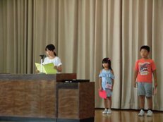 3時間目には終業式を行いました。初めに校長先生から夏休みに頑張ってほしいことの話がありました。次に児童代表として1年生の雪絵恋菜さん、3年生の内海夏輝さん、5年生の猪越望菜さんが1学期の反省を発表しました。続いて全校生で元気に校歌を歌って式は終了しました。