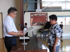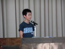 式の後、賞状伝達を行いました。続いて、生徒指導担当、養護教諭より、夏休みの過ごし方の指導をしました。最後に、7/22(土)の「市少年の主張大会」に出る、6年生の清野陽平さんの主張発表を行いました。