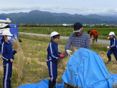 5・6年生は、先日稲刈りをし、さでがけで天日干ししていた稲の脱穀作業を行いました。
