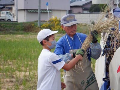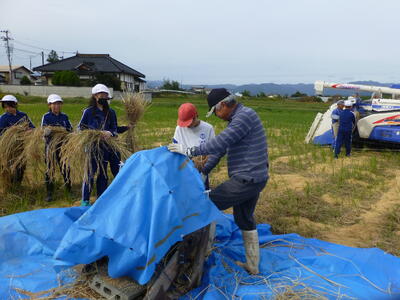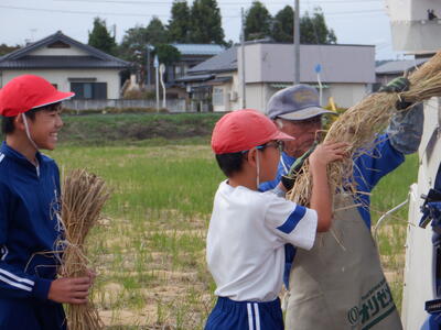 6年生は、昨年度に引き続き2度目の体験のため、足踏みを上手に使いながら脱穀していました。