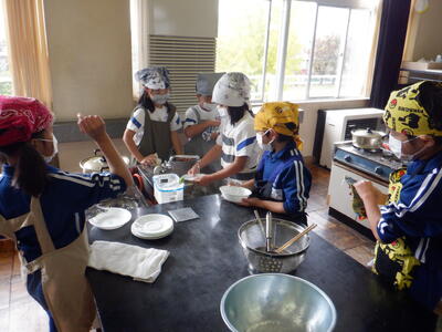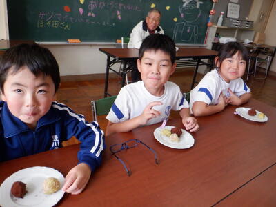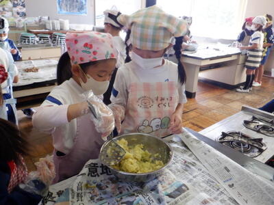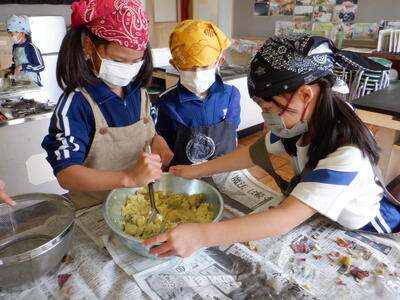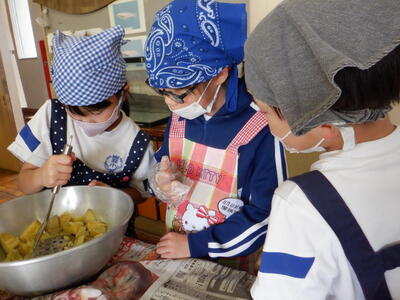 5日、1・2年生は収穫したさつまいもを使って茶巾絞りをつくりました。