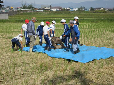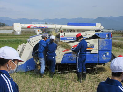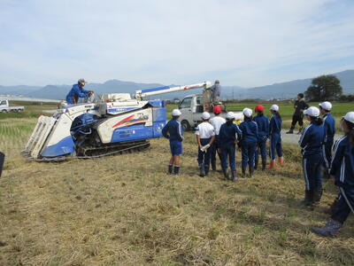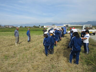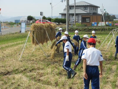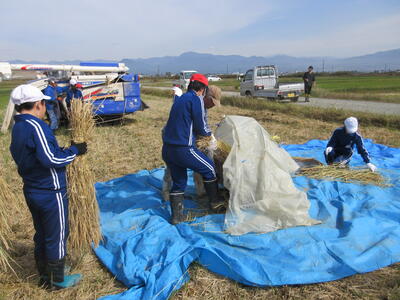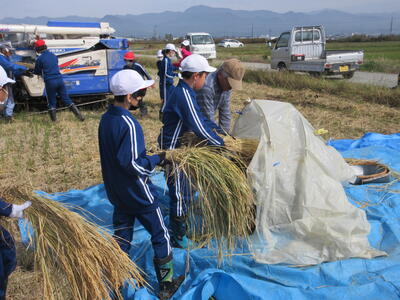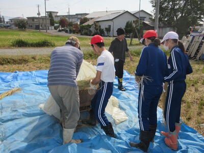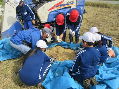 5・6年生が農業科の学習で脱穀を行いました。