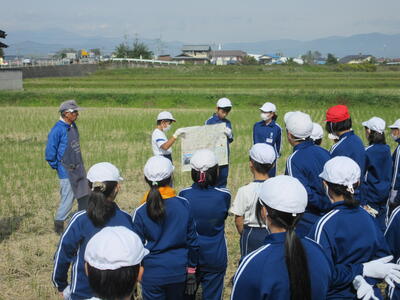 農業科支援員さんにご指導いただき、足踏み脱穀機での脱穀を体験しました。