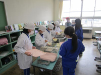 2025年12月10日 16時49分今日は、3年生が収穫したサツマイモを使って調理実習を行いました。特別非常勤講師の宮城先生を含め、3名の先生方に教えていただきながら、サツマイモのホットケーキと大学イモを作りました。