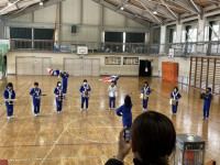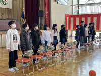 今日は、1年生が体育館で体育をしていました。毎回学習の前に行っている「運動身体作りプログラム」の後、マット運動を行っていました。