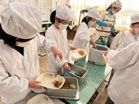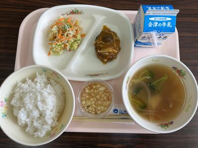 大好き!喜多方の献立「さっぱりしゃきサラダ」は慶徳小学校6年生のお友達が考えてくれたメニューです。ちりめんじゃこが入って、タンパク質やカルシウムと野菜がミックスされていて、歯ごたえも良いおいしいサラダです。キャベツと鶏肉のカレーミルクスープは、福島健康応援メニューの一つで、ほんのりやさしいカレー味のおいしいスープです。