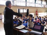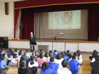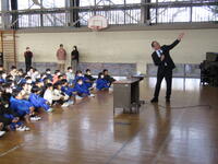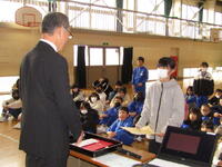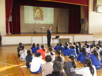 校長講話では、喜多方市にまつわる偉人、中江藤樹、瓜生岩子、そして山都町で生まれた蓮沼門三について、それぞれの先人の功績や思いについてを紹介し、こうした先人たちの教えをもとに、喜多方市人づくり指針『なかよく たくましく 生きる』が出来上がったことを子どもたちに伝えました。
