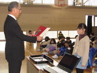 今日は、ボランティア委員会の委員長と副委員長の2名が担当教師とともに、この一年間に集まったペットボトルキャップを、第一生命の方にお渡ししました。