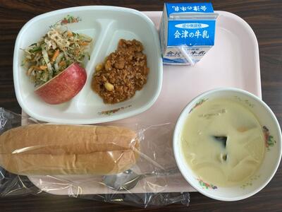 2024年11月26日 13時14分今日の献立は、コッペパン、チリコンカンサンド、さっぱりしゃきサラダ、キャベツと鶏肉のカレーミルクスープ、りんご、牛乳です(634kcal)。