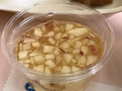 今日のりんごゼリーは、細かい角切りりんごが入った給食センター手作りのおいしいゼリーでした。今日もおいしくいただきました。