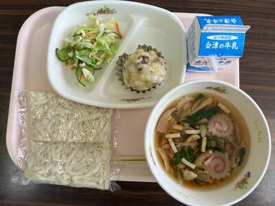 2024年11月28日 15時00分今日の献立は、たまごとじうどん、鬼まんじゅう、かみかみ和え、牛乳です(652kcal)。