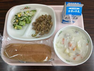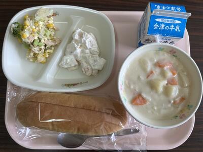 2024年10月22日 16時45分今日の献立は、コッペパン、セルフ焼き肉ドック、イタリアンサラダ、クラムチャウダー、牛乳です(663kcal)。