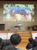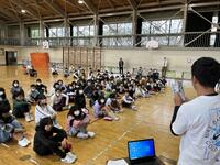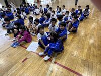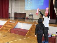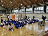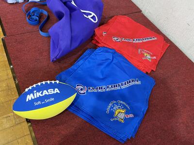 2024年10月23日 17時30分フラッグフットボール協会からの寄贈により、フラッグやベルトが山都小学校に届き、今日は、昼の時間を使った全校集会で、体育主任教師よりフラッグフットボール競技の紹介がおこなわれました。