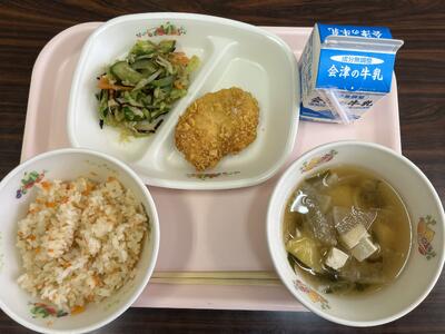 2024年10月23日 13時32分今日の献立は、にんじんごはん、鶏肉のコーンフレーク焼き、きゅうりのしみ昆布漬け、ジャガイモとわかめの味噌汁、牛乳です(678kcal)。