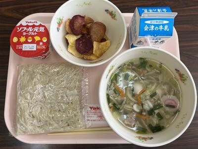2024年10月24日 12時32分今日の献立は、野菜タンメン、スイートポテトチップ、ヨーグルト、牛乳です(669kcal)。
