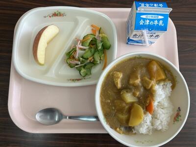 2024年10月25日 16時40分今日のメニューは、秋野菜カレー、キャベツとハムのサラダ、りんご、牛乳です(639kcal)。