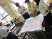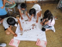 今日は、各家庭からスーパーマーケットなどのチラシを持ち寄りました。