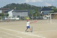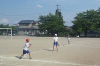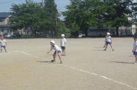 6校時目の体育でティーボールをやっている様子です。ティーに乗せたボールをバットで打ちます。ルールは野球と同じようにしてやっていますが、グローブを使いません。タンブリンで取るようにして「ボン」と音がするとキャッチしたこととして、アウトになるように工夫しています。