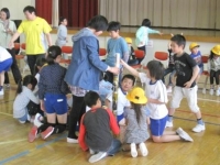 空き缶つみゲームで縦割り班が協力して活動しました。