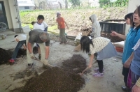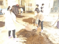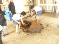 大江さんに教えていただき、5年生が土づくりを行いました。ぼかし、腐葉土、牛ふん、油かすなどを混ぜました。この土をプランターに使い、花苗を植えます。暑いなかよくがんばりました。
