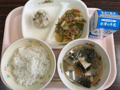 2024年10月4日 12時35分今日のメニューは、ごはん、ほたてしゅうまい、チンジャオロースー、トックスープ、牛乳です(606kcal)。