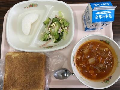 2024年10月9日 12時30分昨日と今日の給食を紹介します。8日は、きなこトースト、ポークビーンズ、イタリアンサラダ、なし、牛乳です(679kcal)。しっとりとしたきなこのペーストがのったおいしいきなこトーストでした。ポークビーンズは、大豆たっぷりの「サンマルちゃんかみかみ献立」(一口30回よくかんで食べることの意識づけを図る献立)です。
