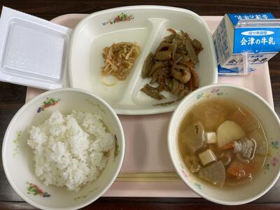 9日は、ごはん、きむたく納豆、きんぴらごぼう、とん汁、牛乳です(608kcal)。