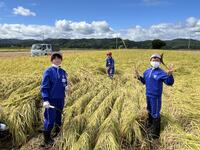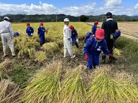 3,4校時、5年生が会津農林高校耶麻校舎の千咲原農場で、6月に田植えをした稲の刈りとり体験をしました。