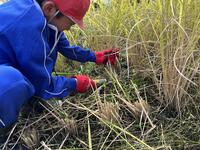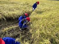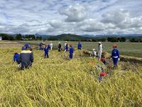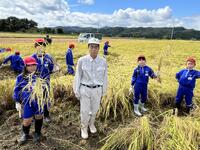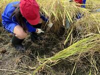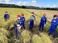子どもたちは、高校生の皆さんや指導員の方に教えていただきながら、稲刈り鎌を使いながら一株ずつ丁寧に稲を刈り取ることができました。