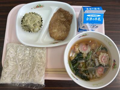 今日のメニューは、秋の味覚うどん、大きいきつね、ずんだだんご、牛乳です(653kcal)。