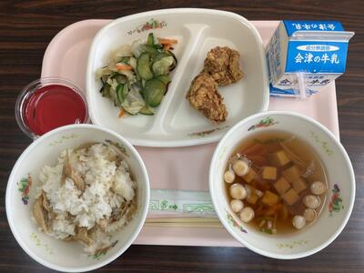 今日は9月生まれお誕生給食です。メニューは、ごぼうごはん、とりの唐揚げ、きゅうりの昆布和え、すまし汁、手作りぶとうゼリー、牛乳です(643kcal)。