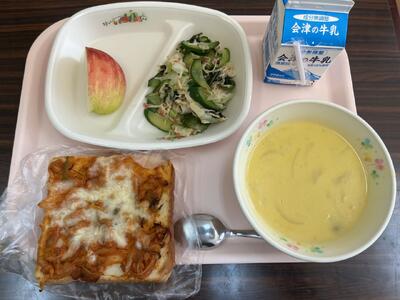 今日のメニューは、ピザパン、カボチャのポタージュスープ、海草サラダ、りんご、牛乳です(679kcal)。