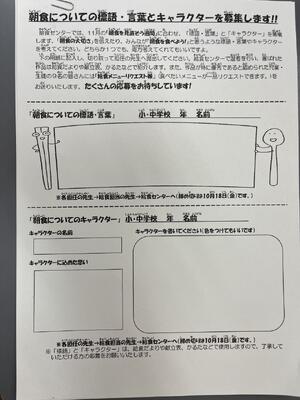 また、11月の「朝食を見直そう週間」に合わせて、山都小学校では、「標語・言葉」「キャラクター」を募集します。今日の給食の時間には、栄養教諭から、募集に関するお便りの説明がありました。多くの皆さんに応募してもらい、朝食の大切さについてより深く考える機会になればと思います。